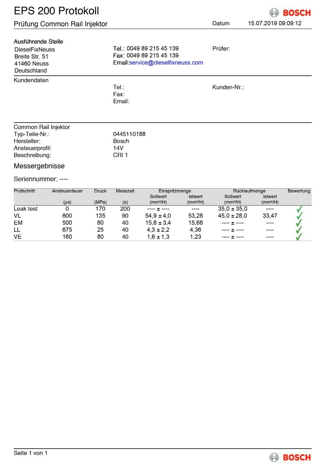 1 x AT inyector incl. anillo de sellado de cobre + junta tórica + informe de prueba BOSCH suministrado.